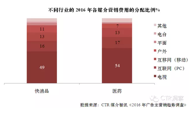 CTR媒介智訊《2016年廣告主營銷趨勢調(diào)查報(bào)告》顯示,快消品、醫(yī)藥類企業(yè)在2016年?duì)I銷預(yù)算中分別將49%、54%的比例分配給了電視。