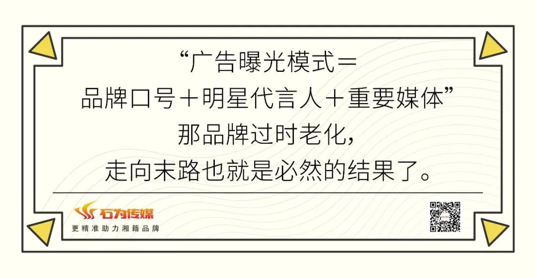 如果之前的老字號品牌還繼續沿用之前的常規一套:“廣告曝光模式=品牌口號+明星代言人+重要媒體”那品牌過時老化,走向末路也就是必然的結果了。