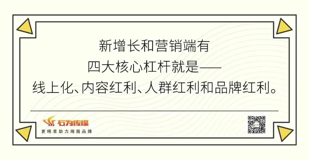 在新的增長和營銷端,有四大因素在快速驅動這波新消費品牌的增長,并且這波紅利才剛剛開始。這幾個核心杠桿就是——線上化、內容紅利、人群紅利和品牌紅利。