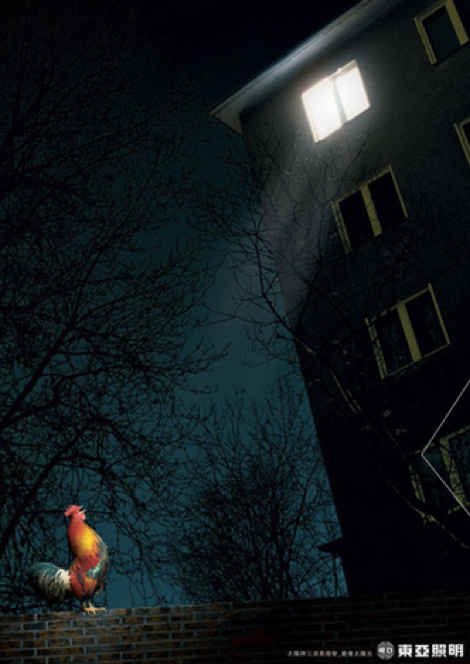 燈管是本體,太陽光是喻體。強調燈管高亮的特點,亮到連公雞都以為是太陽光,像極了公雞報曉:早安,打工人!
